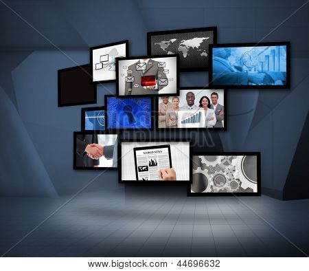 Many screens showing business images under a spotlight on digital background | 438 | 384 | |