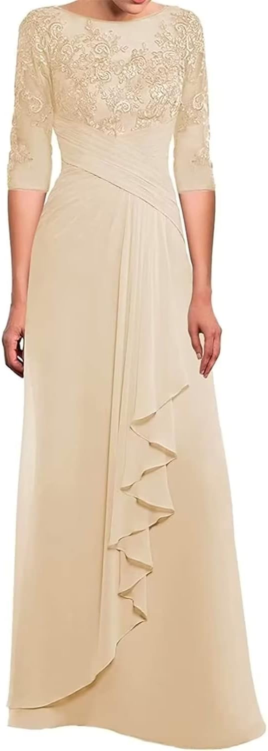 B0BB6JKXCK | 2023-04-16T00:00:00 | Long Mother of The Bride Dress for Wedding Lace Appliques 3/4 Sleeves Chiffon Formal Evening Party Prom Gowns for Women Champagne US20W | Welcome to TTdamai We are a professional manufacturer and seller of evening dress, wedding dress, bridesmaid dress, prom dress, homecoming dress, cocktail dress, party dress, junior dress and many other formal party gowns. Product Information Fabric: chiffon and lace appliques Neckline: round neck Sleeves: 3/4 sleeve S... | meta_Amazon_Fashion | AMAZON FASHION | [] | TTdamai | 2.8 | 2 | null | [