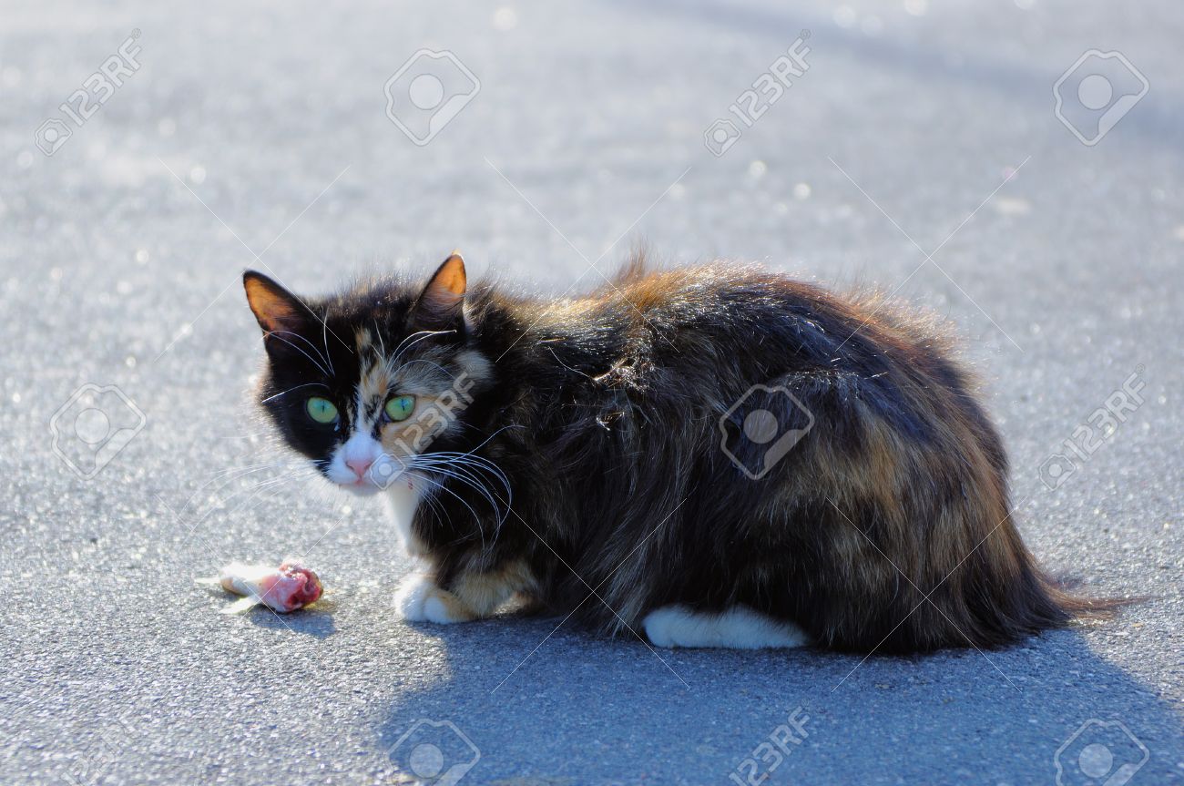 旁边的猫坐在一半 - 吃鱼的行业