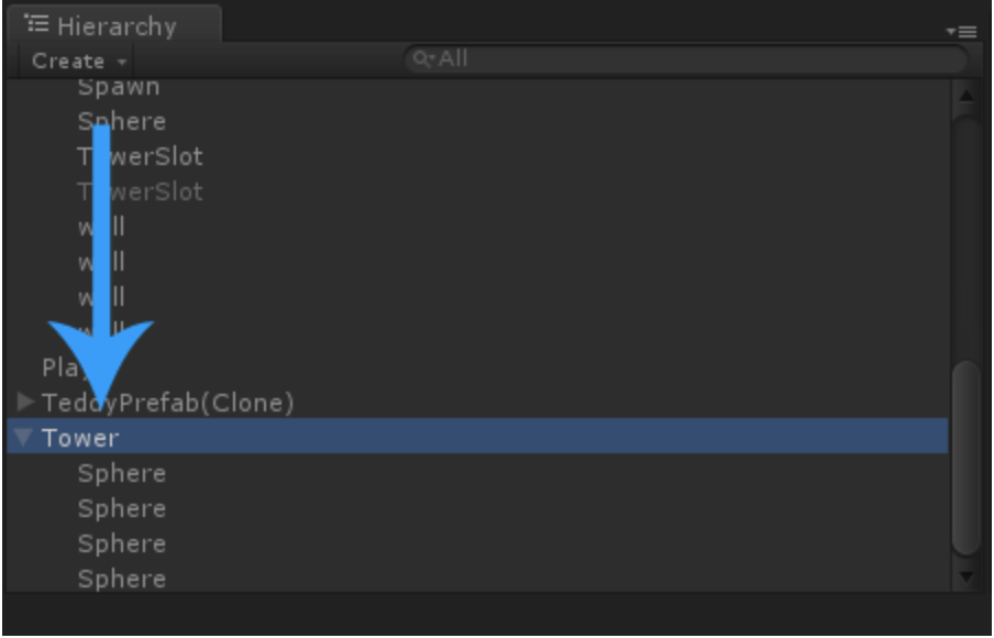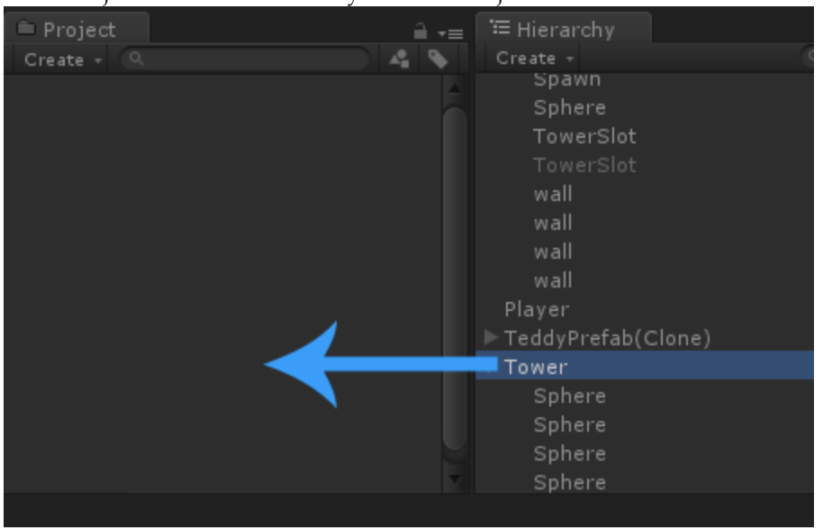 When the player starts the game, usually there are no Towers in the scene yet. What we need is a way to save our Tower GameObjects somewhere and then load them into the Hierarchy again as soon as the player wants to build a tower.