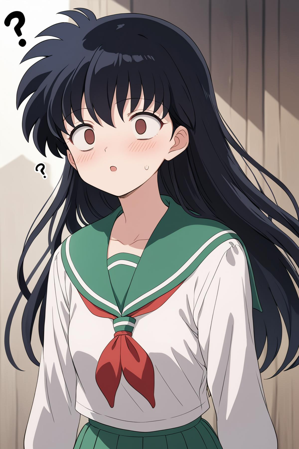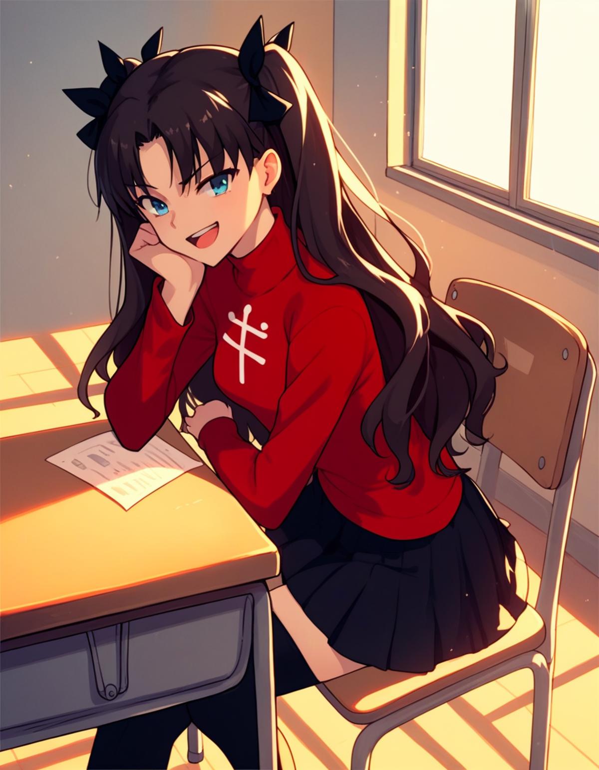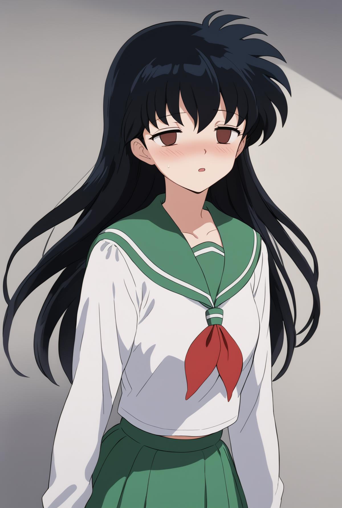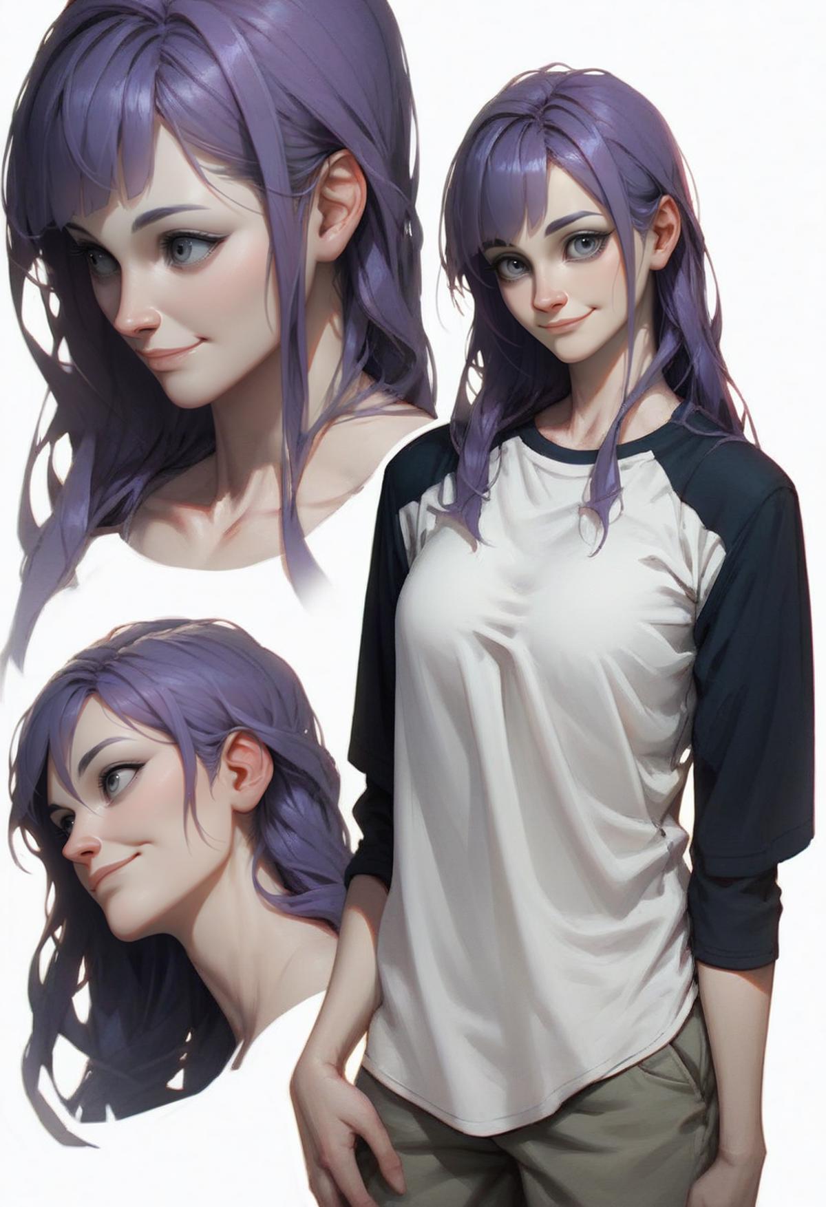 Add "high collar, purple vest, white shirt, ascot, long sleeves, black skirt, black pantyhose" for her typical look.
