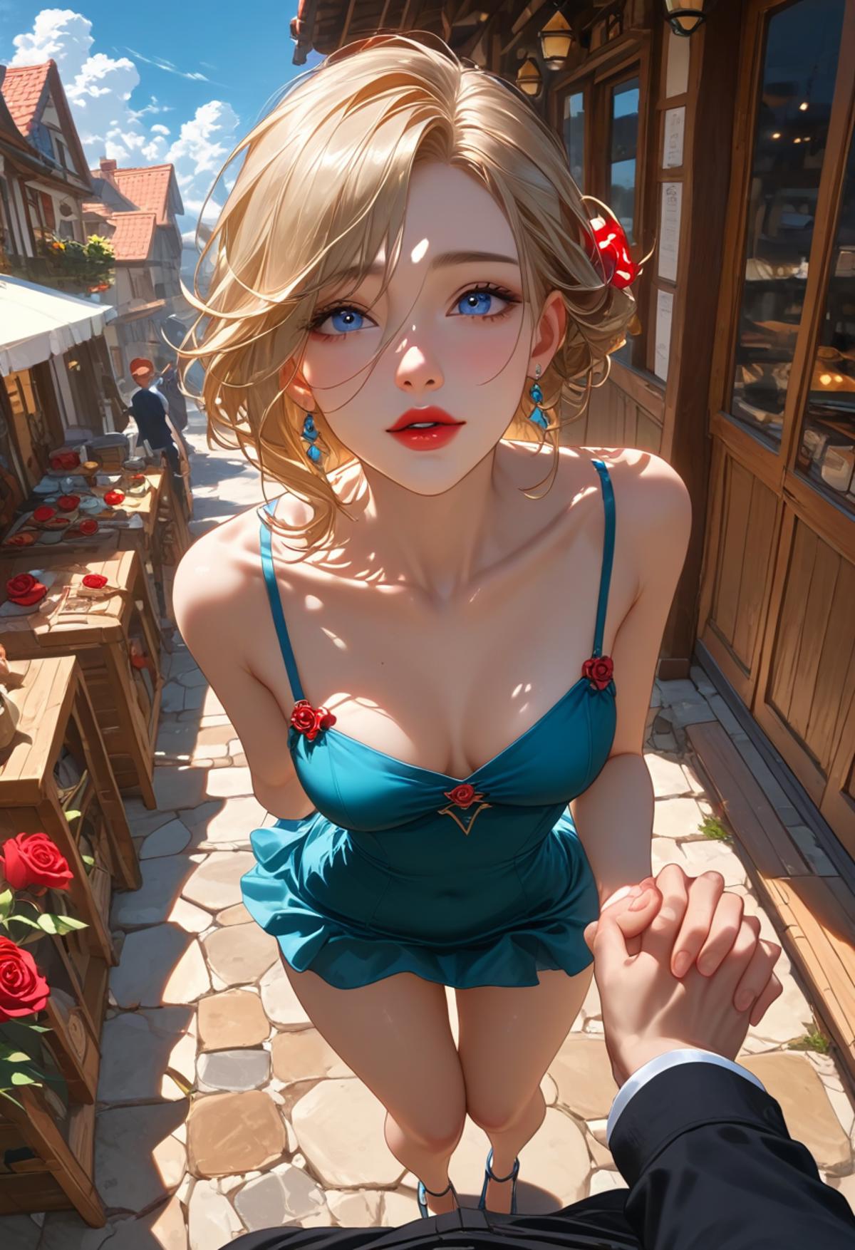 Mistral: weissmistral, scar across eye, side ponytail, hair ornament, tiara, shrug \(clothing\), short dress, blue dress, long sleeves, earrings, cleavage