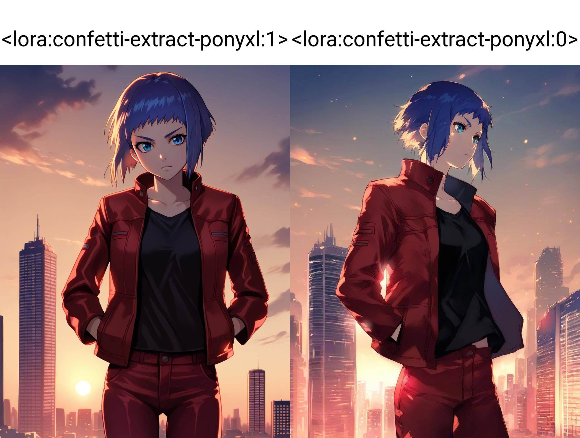 I've trained the second model, but this time on a base model, which is supposed to make it possible to use LoRA on any model, but not really (anime models seem to struggle a lot). So my examples are not only from Animagine v3 on this one. As of now, it isn't wholly accurate, but it really depends on the model. I trained this model as a substitute, if the other one doesn't work at all.