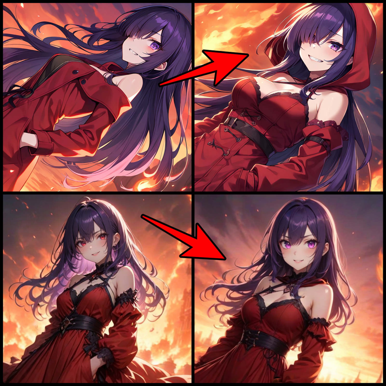 Default Outfit: red cape, black dress, corset, white shirt, long sleeves, black skirt, black thighhighs, bandolier