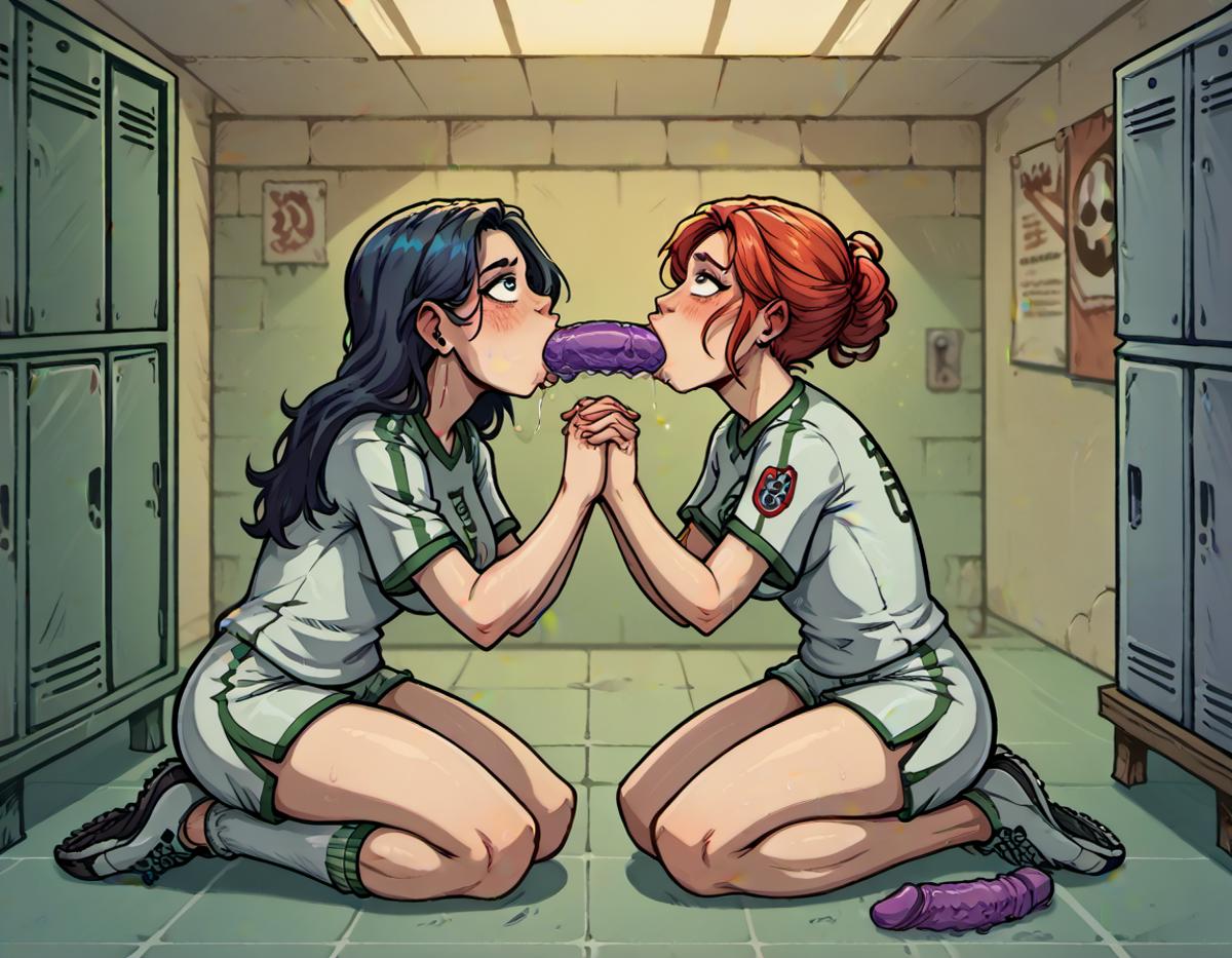 Pony embedding to solicit two women sharing a deepthroated dildo on the way to a kiss.