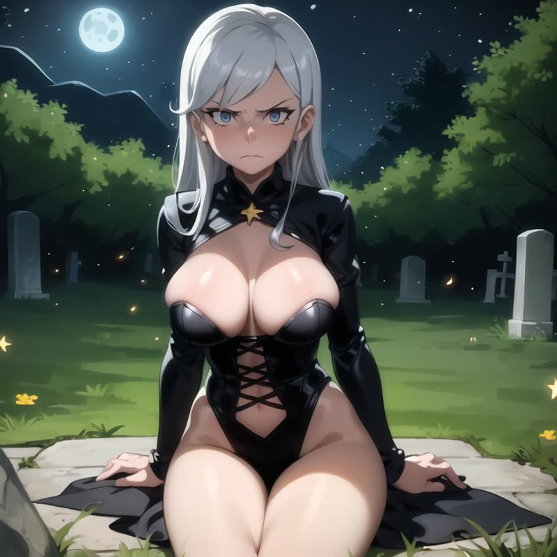 best quality, (masterpiece:1.1), 1girl, silver hair, serious face, looking at viewer, cute, sitting, fantasy, RPG, witches outfit, cemetery, large breasts, blue eyes, solo, night sky, moonlight, rock, grass, stars, fireflies