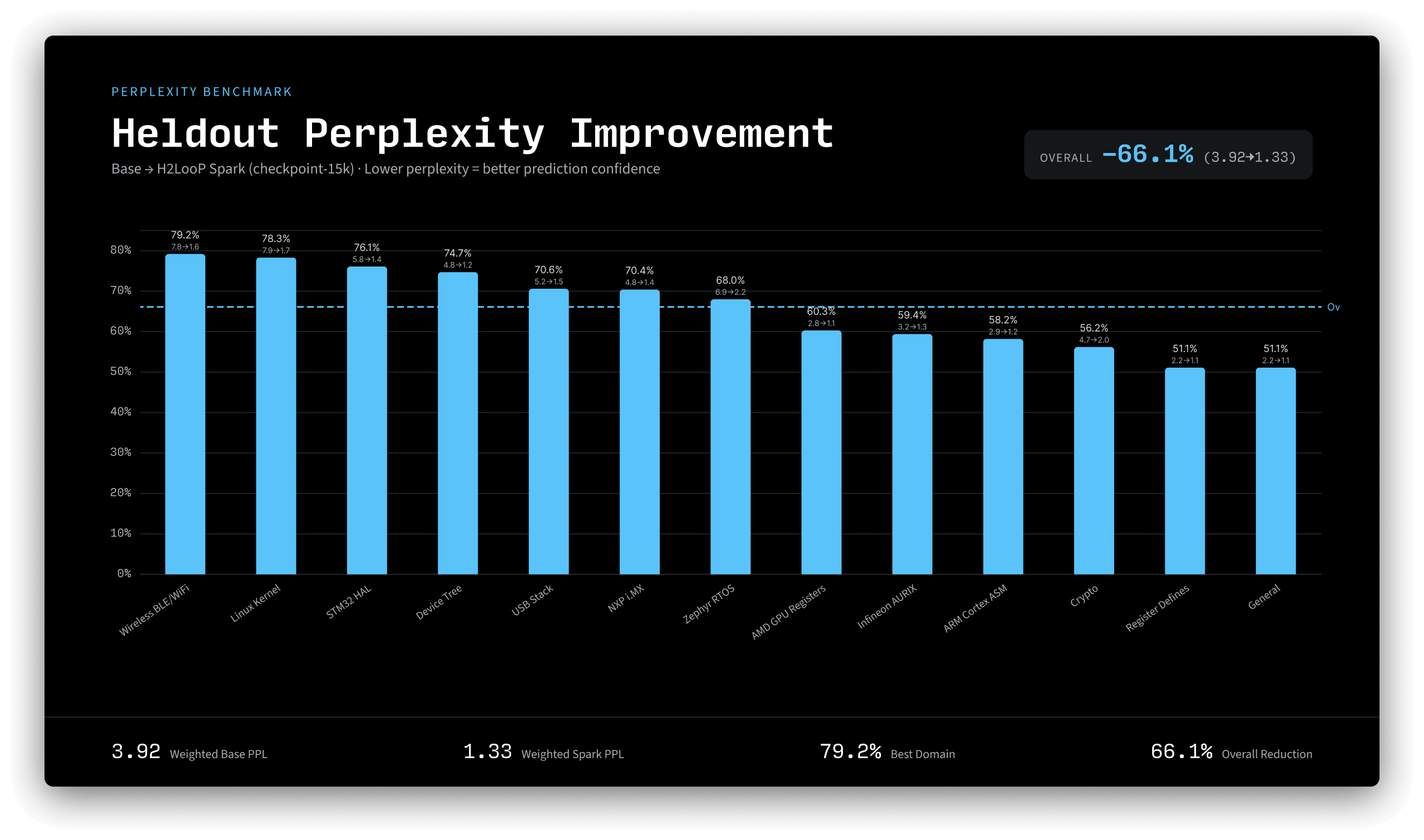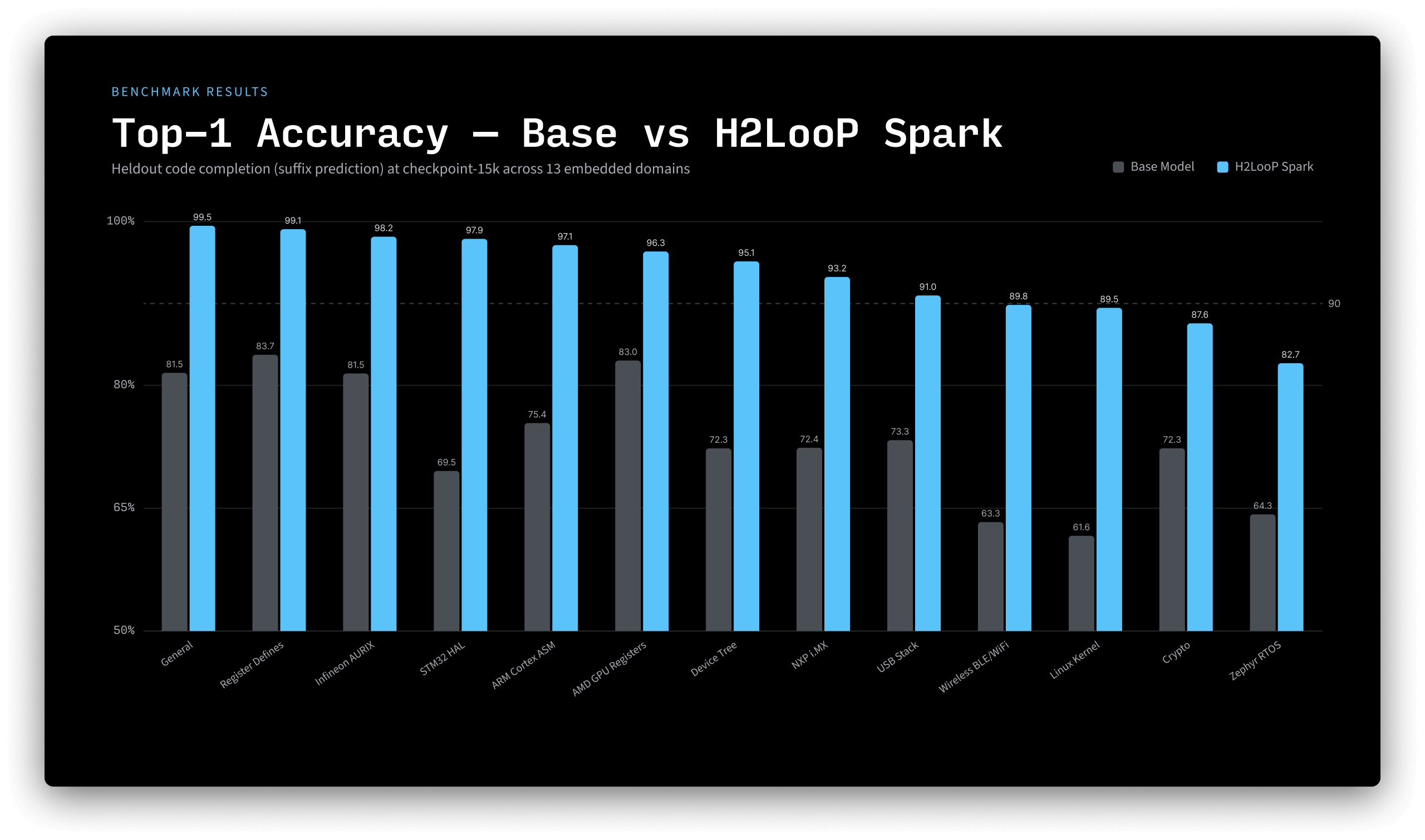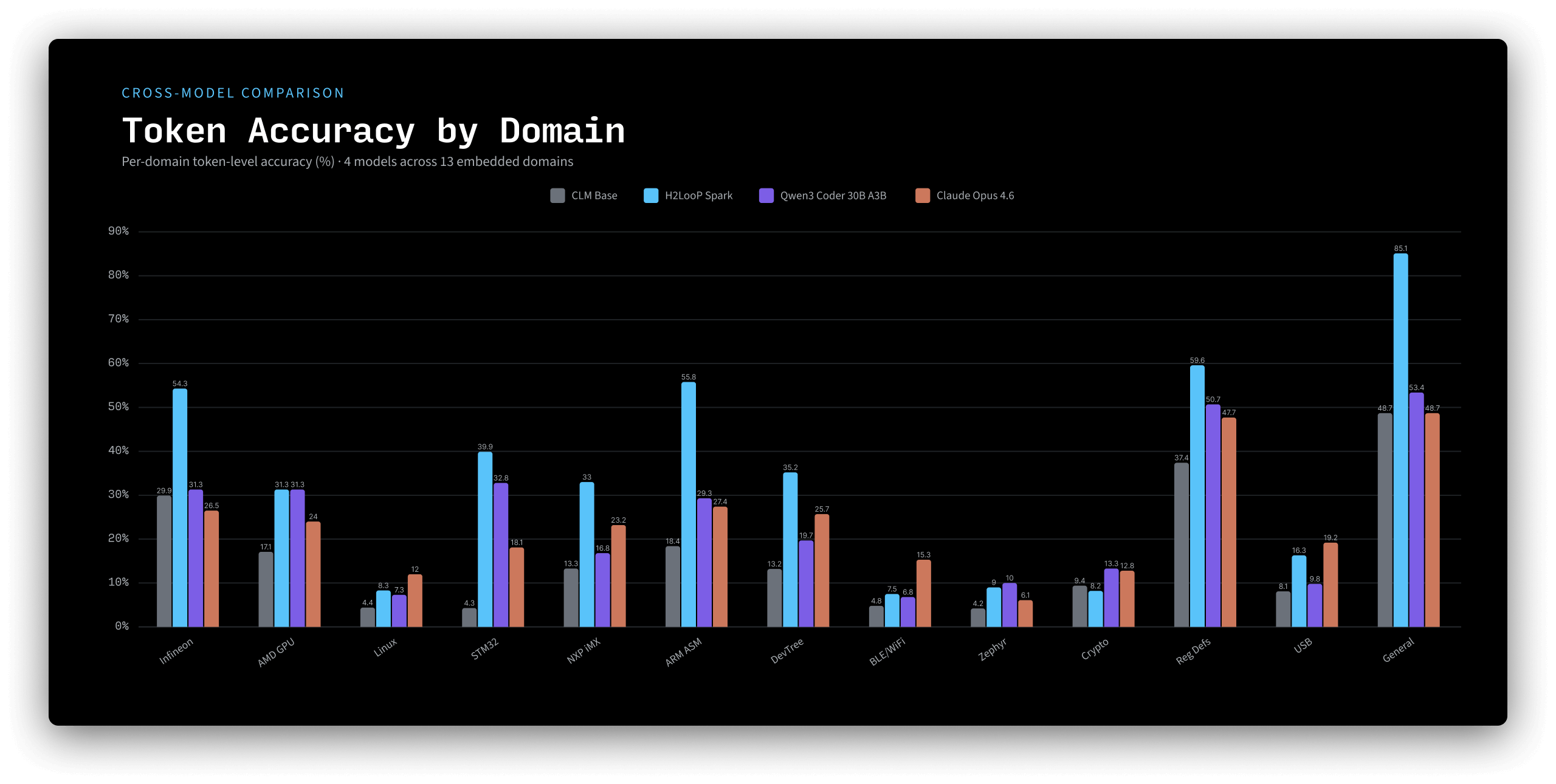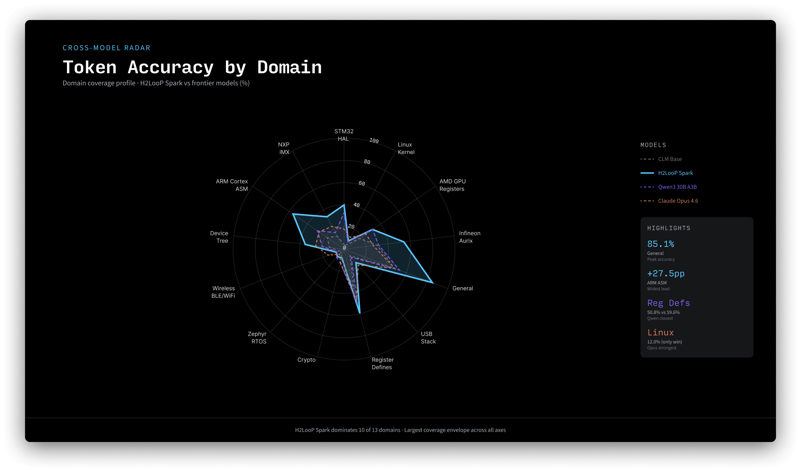 H2LooP builds specialized AI for embedded systems engineering. Spark is our first open-source release - demonstrating that focused continual pre-training on curated domain data can push a 7B model past frontier-class models on domain-specific tasks.