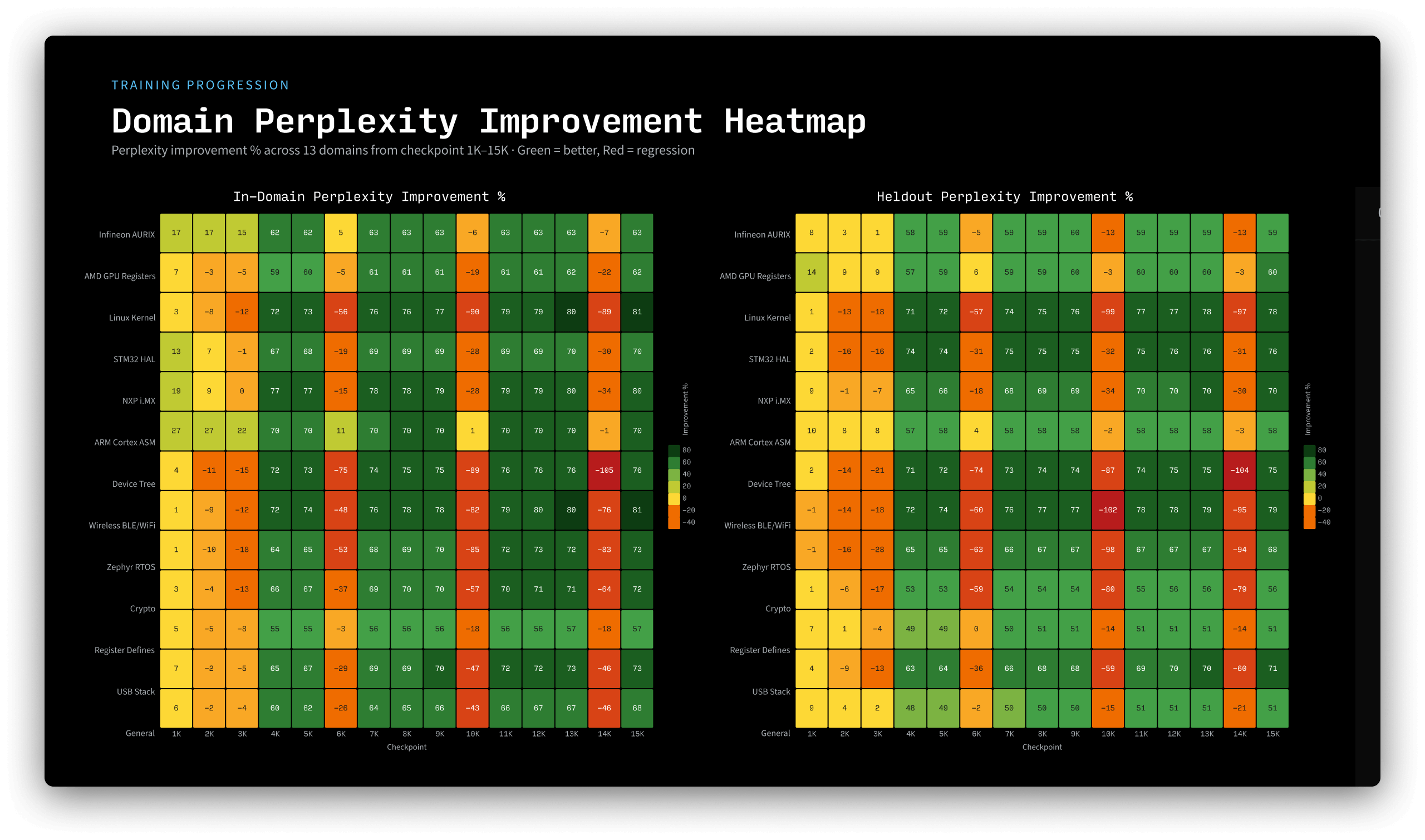 We measured perplexity on held-out code from 9 public repositories not seen during training (Linux kernel, Zephyr RTOS, STM32 HAL, CMSIS, wolfSSL, mbedTLS, TinyUSB, NXP MCUXpresso SDK, Infineon AURIX) across 13 embedded-systems categories.