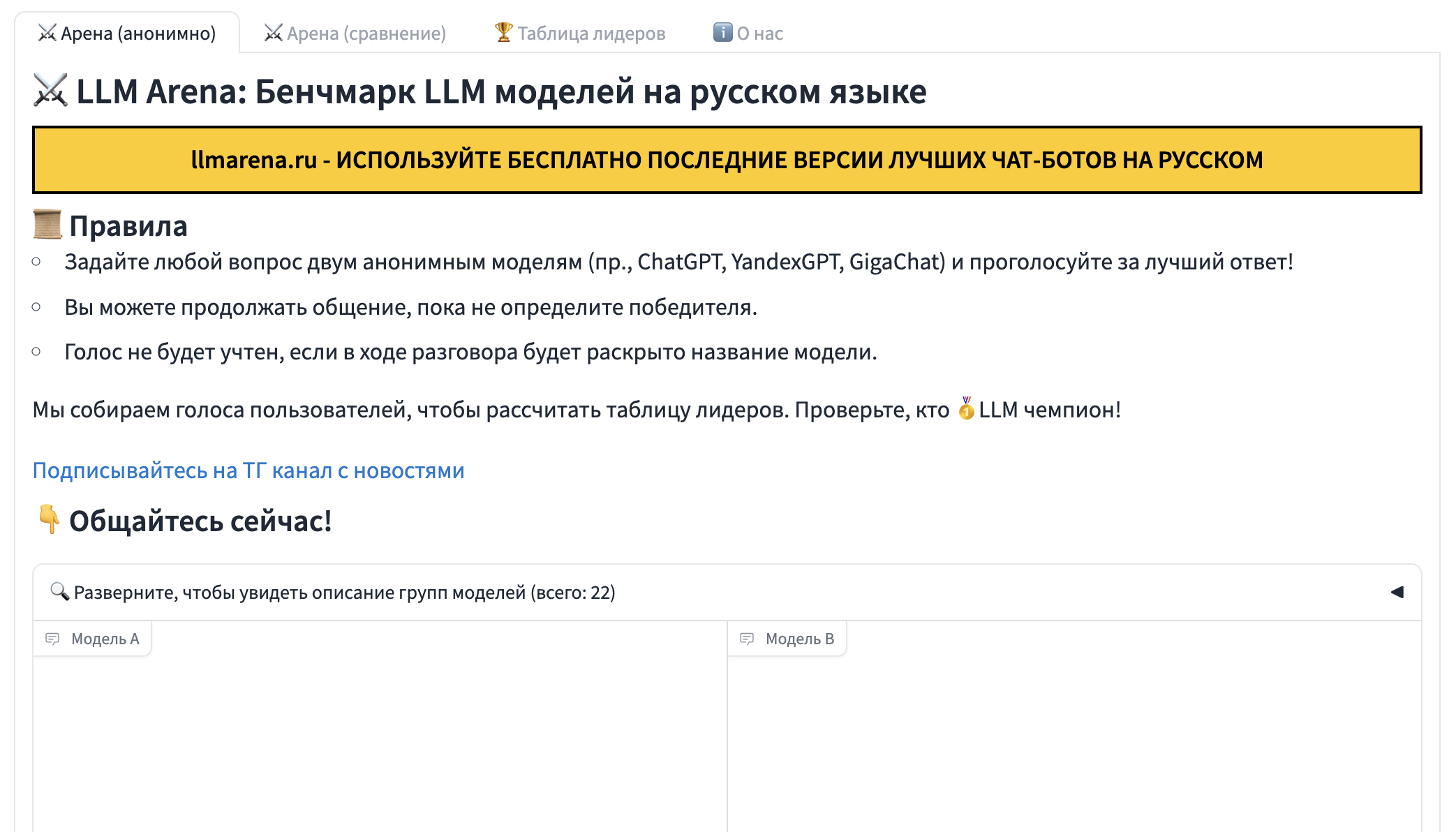 Anonymous Chat (https://llmarena.ru/?arena): Users can engage in a blind test, posing questions to two anonymous models simultaneously. This allows for unbiased comparisons and helps us gather valuable user feedback for building our leaderboard.