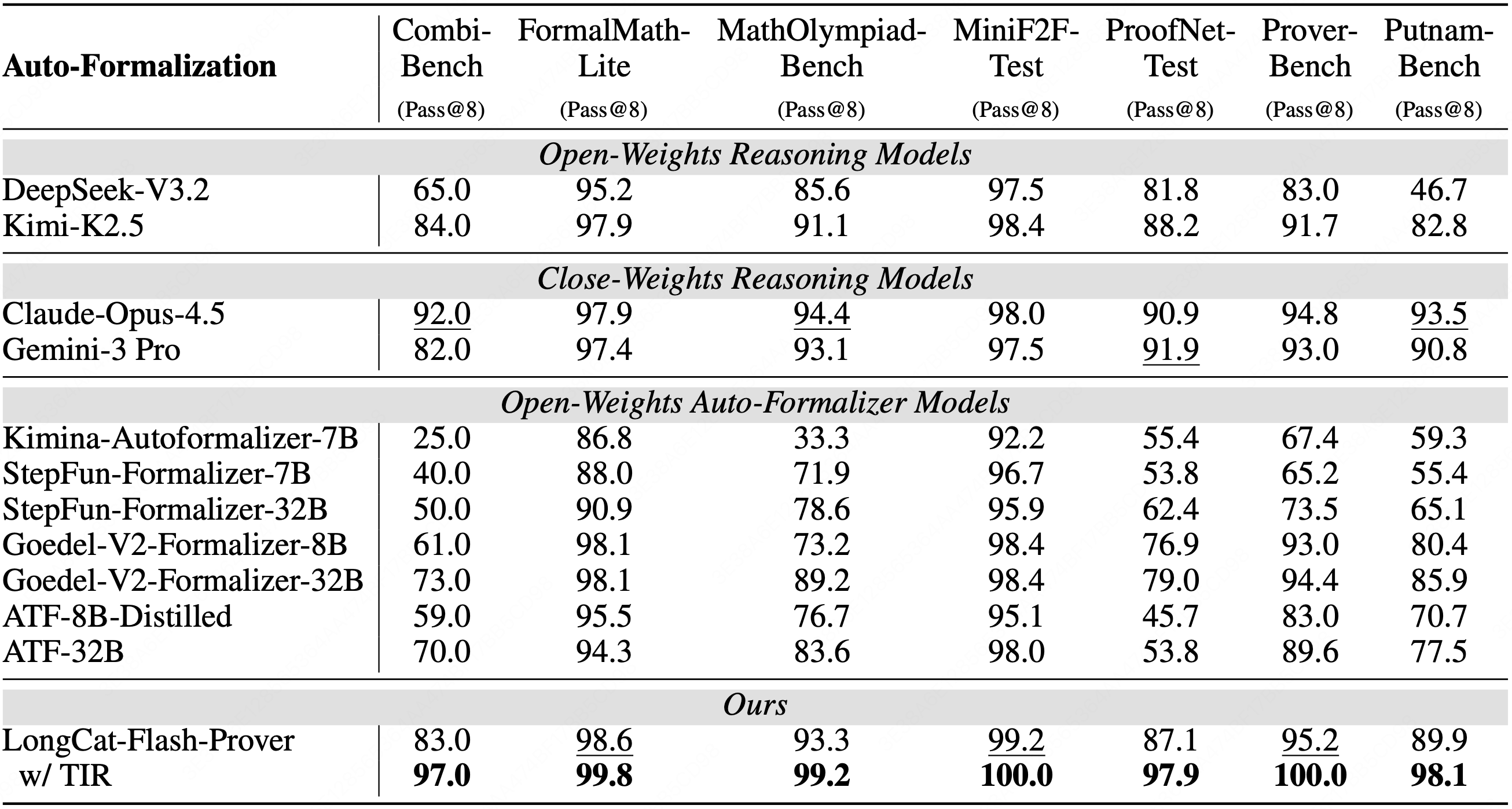 Auto-formalization performance (Pass@8 metric, %) of different reasoning and specific auto-formalizer models across multiple benchmarks. Best in bold, second best in underlined.