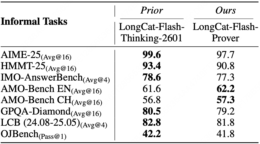 Performance (%) comparison across multiple general reasoning benchmarks. Best in bold. The result indicates that our LongCat-Flash-Prover can retain the general reasoning ability.