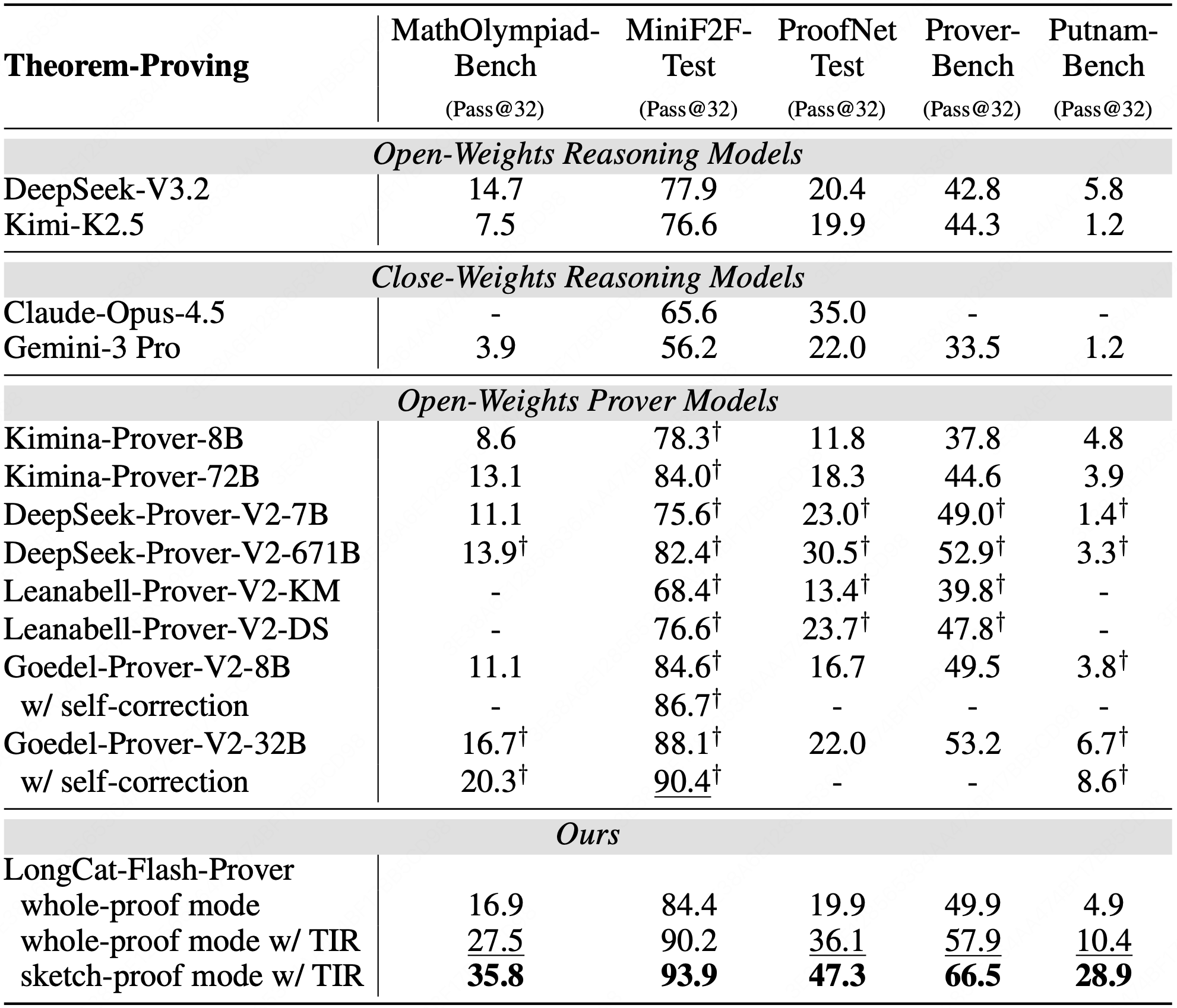 Theorem-proving performance (Pass@32 metric, %) of different reasoning and specific prover models across multiple benchmarks. Best in bold, second best in underlined. † indicates the score is from external reports.