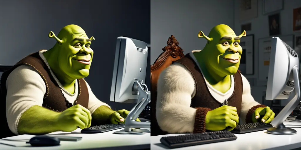 realistic human Shrek blogging at a computer workstation, hyperrealistic award-winning photo for vanity fair (cfg = 13, seed = 56583700)