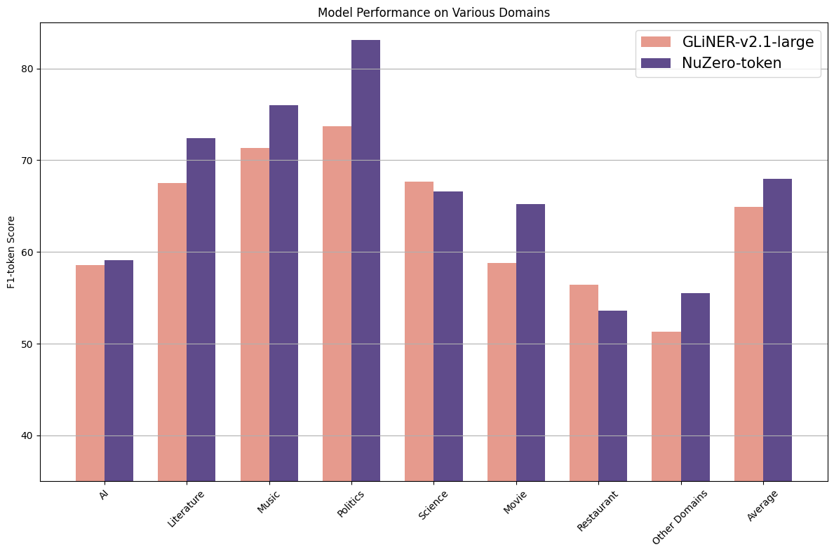 NuNER Zero is (at the time of its release) the best compact zero-shot NER model (+3.1% token-level F1-Score over GLiNER-large-v2.1 on GLiNERS's benchmark)