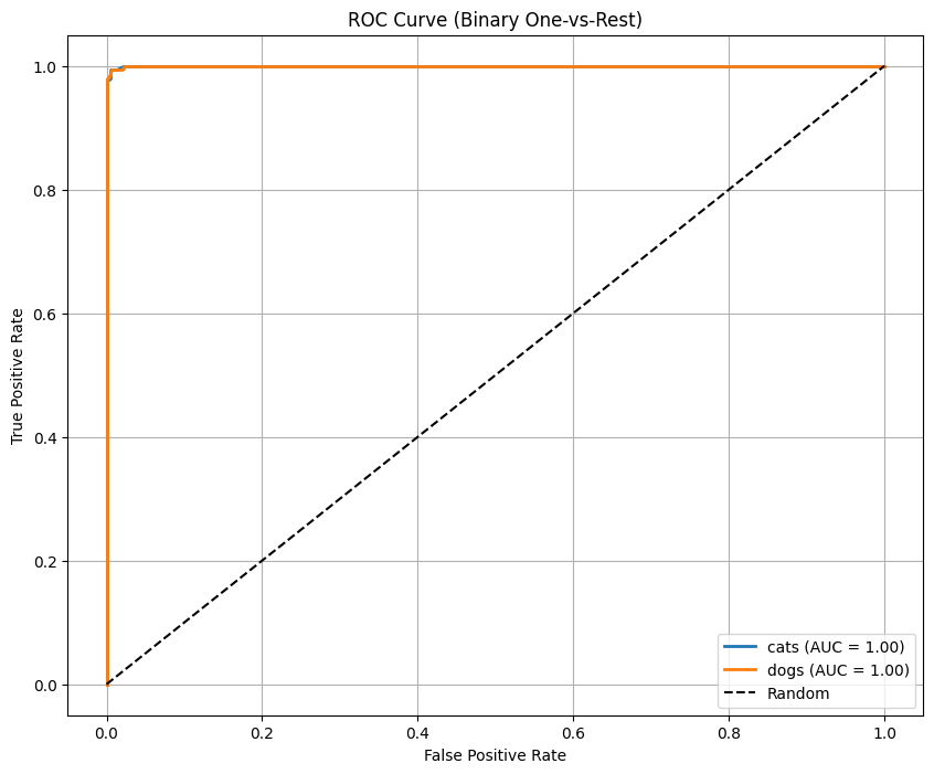 Observation: Most predictions lie along the diagonal, meaning the model correctly classifies both cats and dogs most of the time.