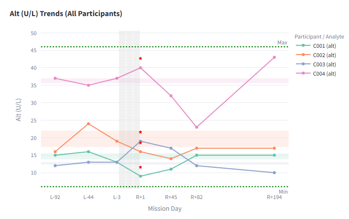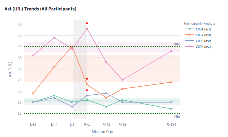 You’ll note that across all four astronauts ALT showed significant deviations while AST did in just three. You’ll note that in one astronaut (C004) the AST ranges shifted outside of what is classically considered the healthy limits of the liver (green dotted line). Eureka, there’s a huge finding. Space is actually harmful to human liver with even just three-days in space showing significant variance.