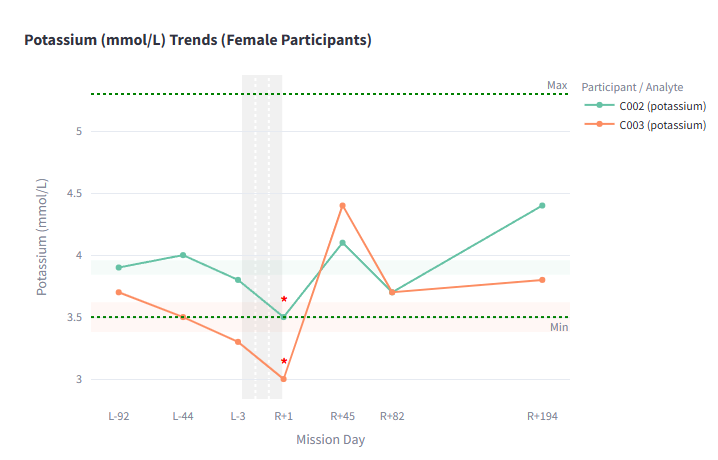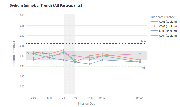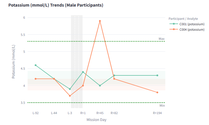 Finally, the consistent decline in sodium levels across all crew members highlighted how fluid and hydration balance is disrupted in space. While reduced appetite and altered kidney function have long been reported by astronauts, the clear biochemical signal of these changes reinforces how tightly linked and vulnerable these processes are.