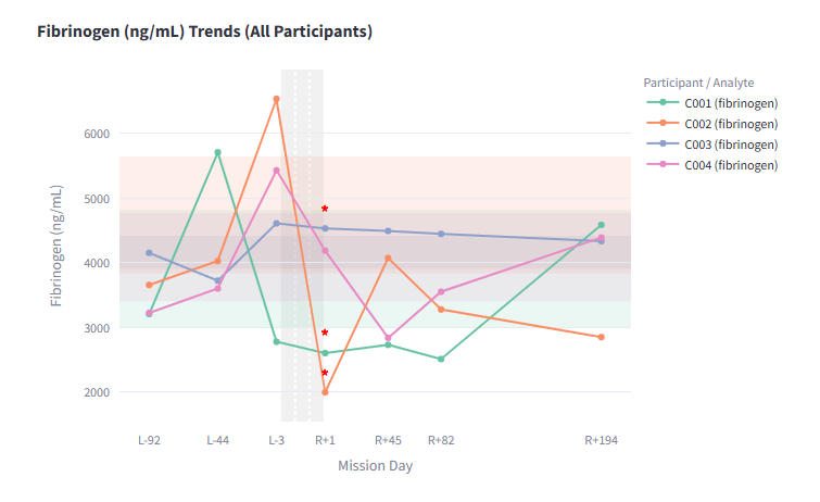 You’ll note that these updated figures look slightly differently. We have our ranges considered normal for each astronaut that stem from our original pre-launch samples. Because the Inspiration4 mission was short and each astronaut’s sampling schedule was slightly different, we created a “stretched” flight timeline. This allowed us to align measurements across individuals, making it easier to compare patterns and visualize how the body changes over the course of a spaceflight. We had to artificially pretend the flight was 30 days to get this effect but the graphs are much cleaner.