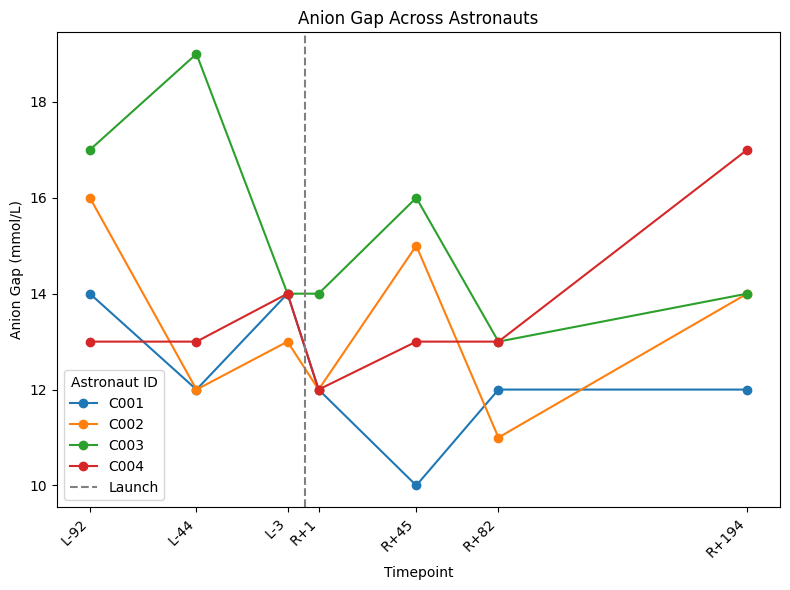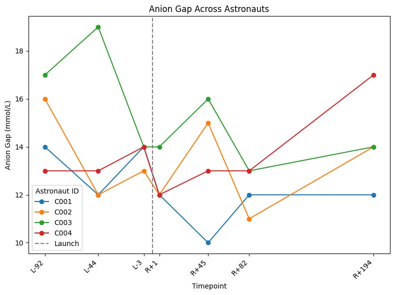 Then, we engineered new features to capture patterns not directly reported. One example is the Anion Gap, a standard clinical calculation that tracks shifts in electrolyte balance. On Earth, doctors use it to monitor conditions like dehydration or metabolic stress. In orbit, it provides a window into how spaceflight affects fluid and chemical balance inside the body. In particular, we could see if changes in sodium, potassium and other electrolytes trended together (no significant shifts) or if some of these changes occurred at different rates indicating troubles with respiration or liver function. Taken in aggregate we can consider the health of our astronauts as if we are a doctor monitoring the vitals of a patient in the hospital.