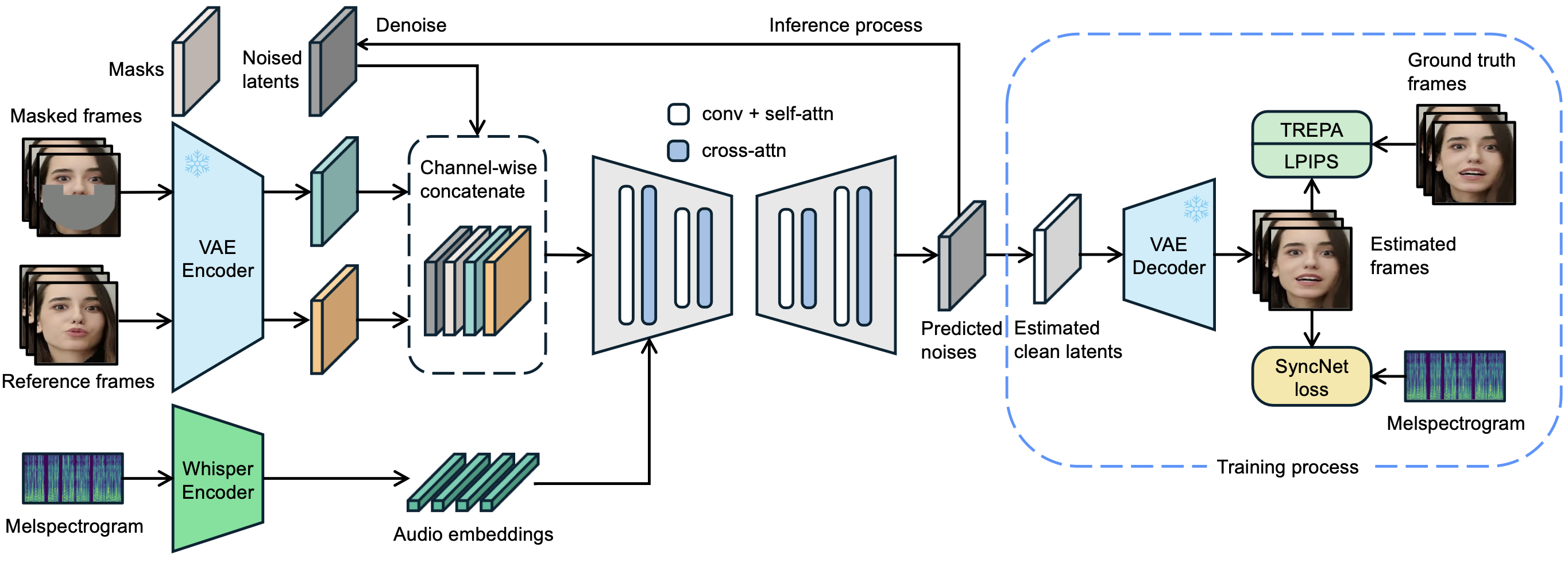 LatentSync uses the Whisper to convert melspectrogram into audio embeddings, which are then integrated into the U-Net via cross-attention layers. The reference and masked frames are channel-wise concatenated with noised latents as the input of U-Net. In the training process, we use one-step method to get estimated clean latents from predicted noises, which are then decoded to obtain the estimated clean frames. The TREPA, LPIPS and SyncNet loss are added in the pixel space.