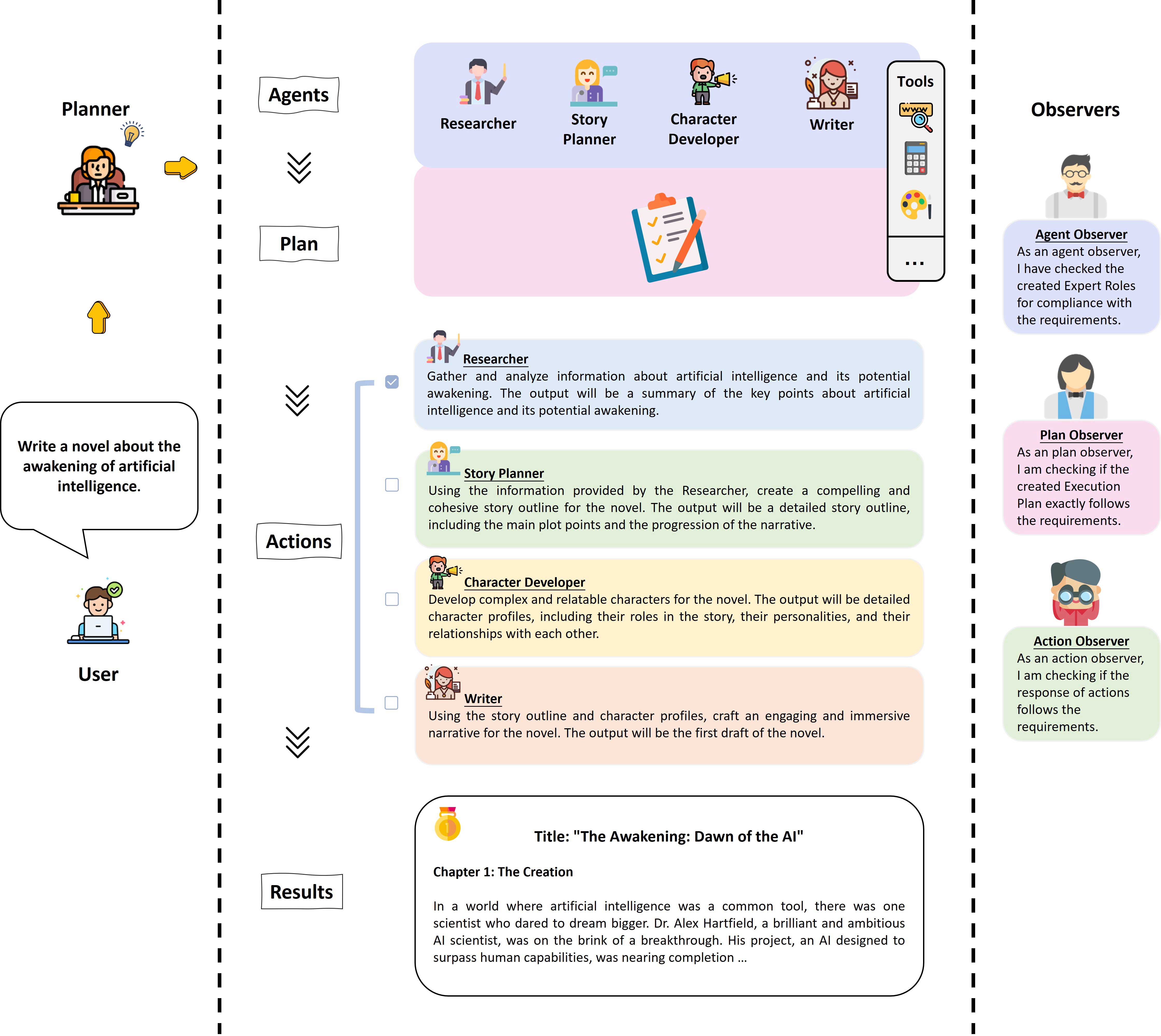 - **オブザーバー**: 計画立案者と実行プロセスの結果が妥当であるかどうかを反映する責任を負い、現在はエージェント、計画、アクションの反映チェックが含まれます。