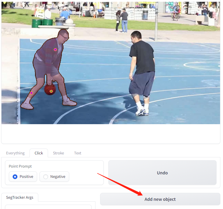 1. Once we interactively add an object mask, we can click the Add new object button to prepare to add a new object.