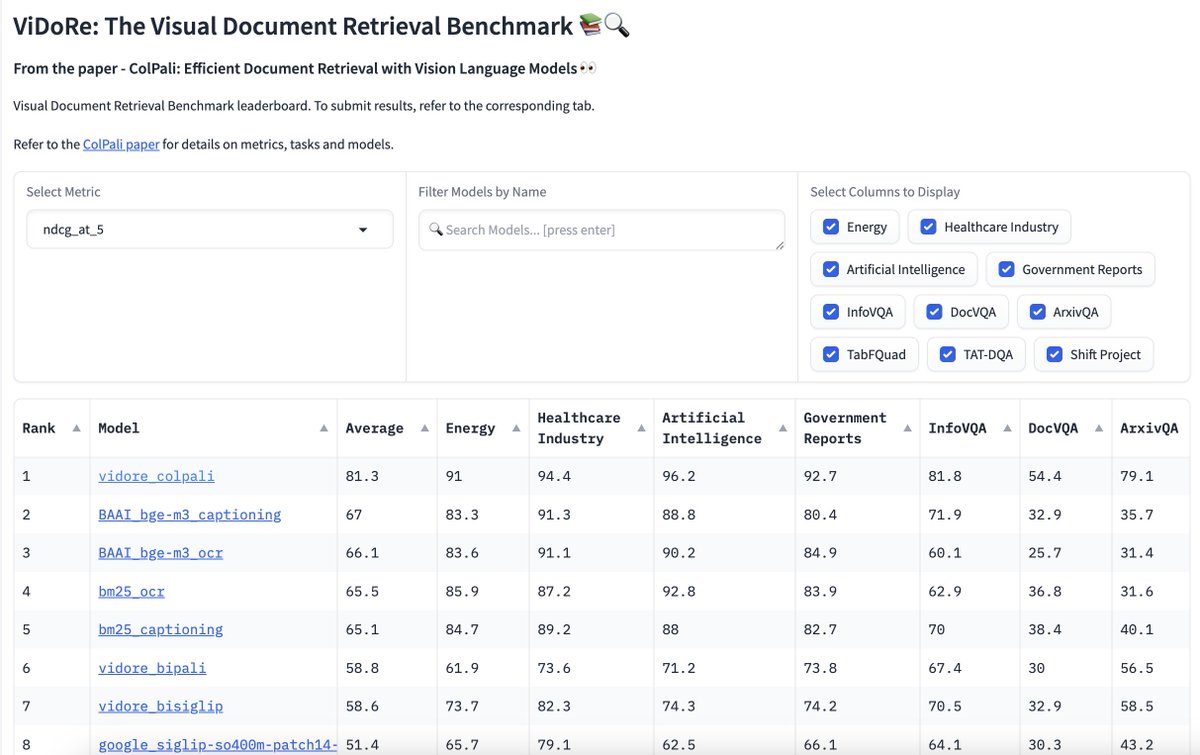 The authors also released a new benchmark for document retrieval, [ViDoRe Leaderboard](https://huggingface.co/spaces/vidore/vidore-leaderboard), submit your model! """)