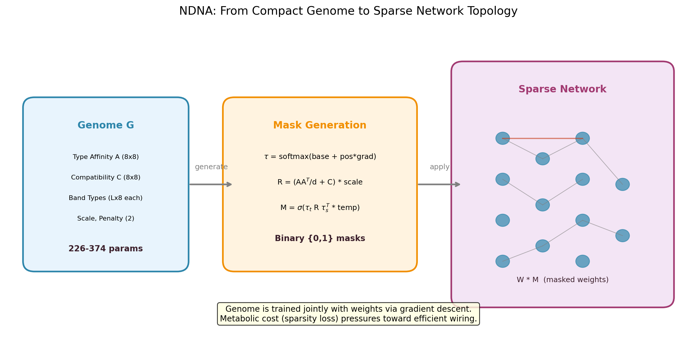 Neural networks typically use fixed, fully-connected layers. NDNA asks: what if a small "genome" could learn which connections should exist?