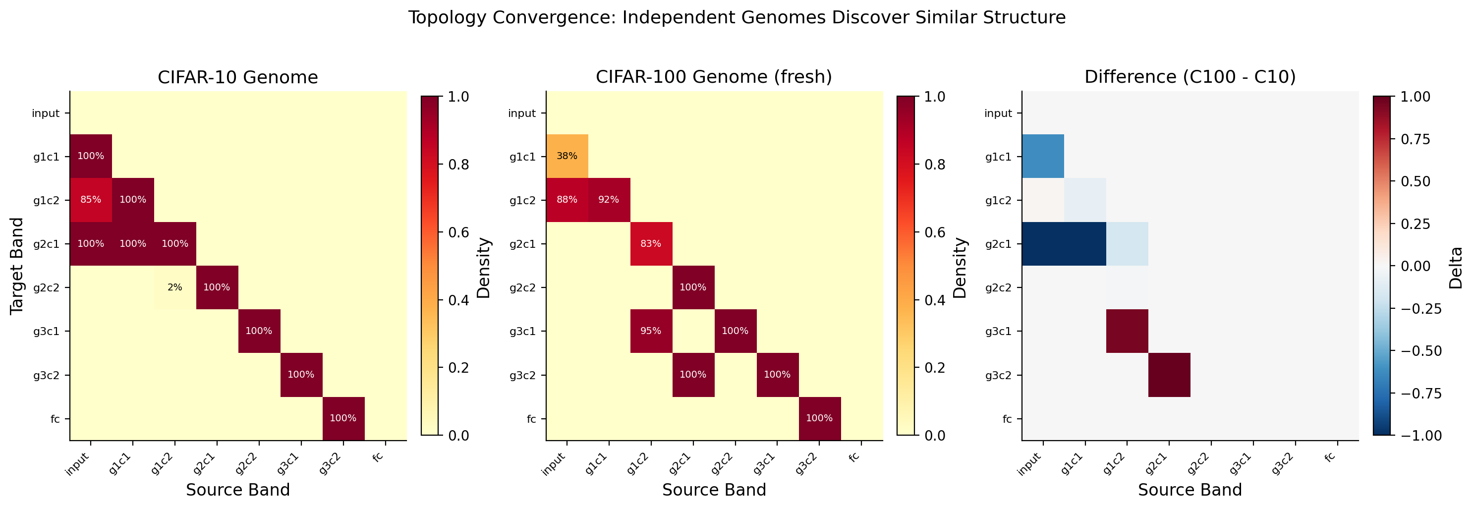 The CIFAR-100 genome was not trained on CIFAR-100. It is the CIFAR-10 genome applied directly to CIFAR-100 without retraining the topology. Only the network weights were retrained. The genome's learned connectivity pattern transferred across tasks and still beat random sparse wiring by +7.01%.